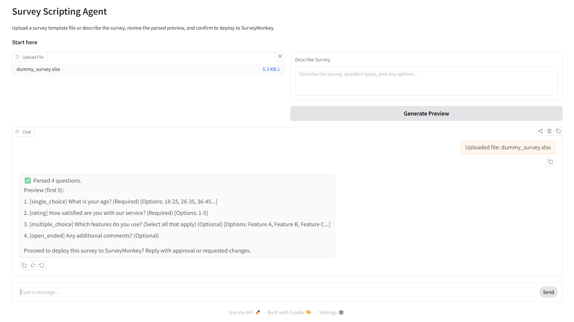 A proof of concept “survey scripting agent”, that takes a survey specification (either an Excel/CSV template or a free-text description), converts it into a structured survey template, and then deploys the survey to SurveyMonkey.