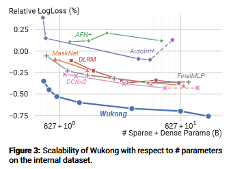 To demonstrate Wukong’s scaling properties, the authors evaluate on an internal Meta dataset containing 146 billion samples and 720 features — roughly 37× more samples and 18× more features than Criteo, the largest widely used public benchmark. On this dataset, Wukong exhibits consistent scaling behaviour, with Log Loss decreasing steadily as the number of parameters increases. In contrast, baseline architectures show diminishing or inconsistent returns from additional parameters, reinforcing the paper’s central claim that Wukong’s architecture is better suited to scaling. That said, the scaling analysis is conducted exclusively through the lens of Log Loss, and it would be valuable to see whether these gains hold under alternative metrics that more directly reflect recommendation quality.